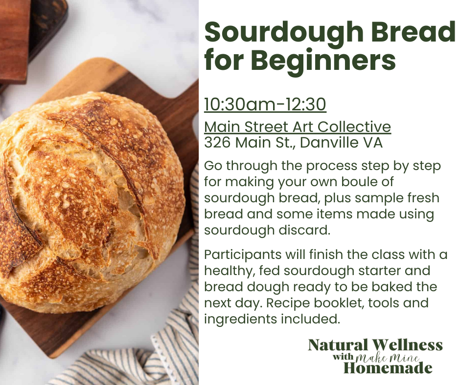 This hands-on, in person sourdough workshop is being held at Main Street Art Collective (326 Main St, Danville VA) from 10:30am-12:30pm.
