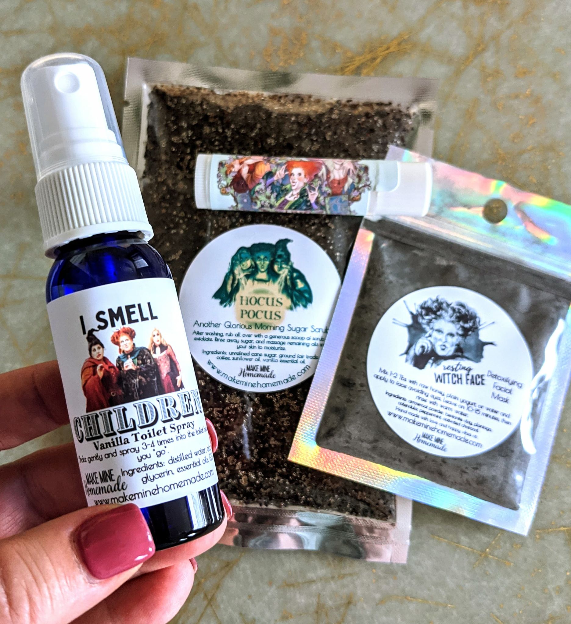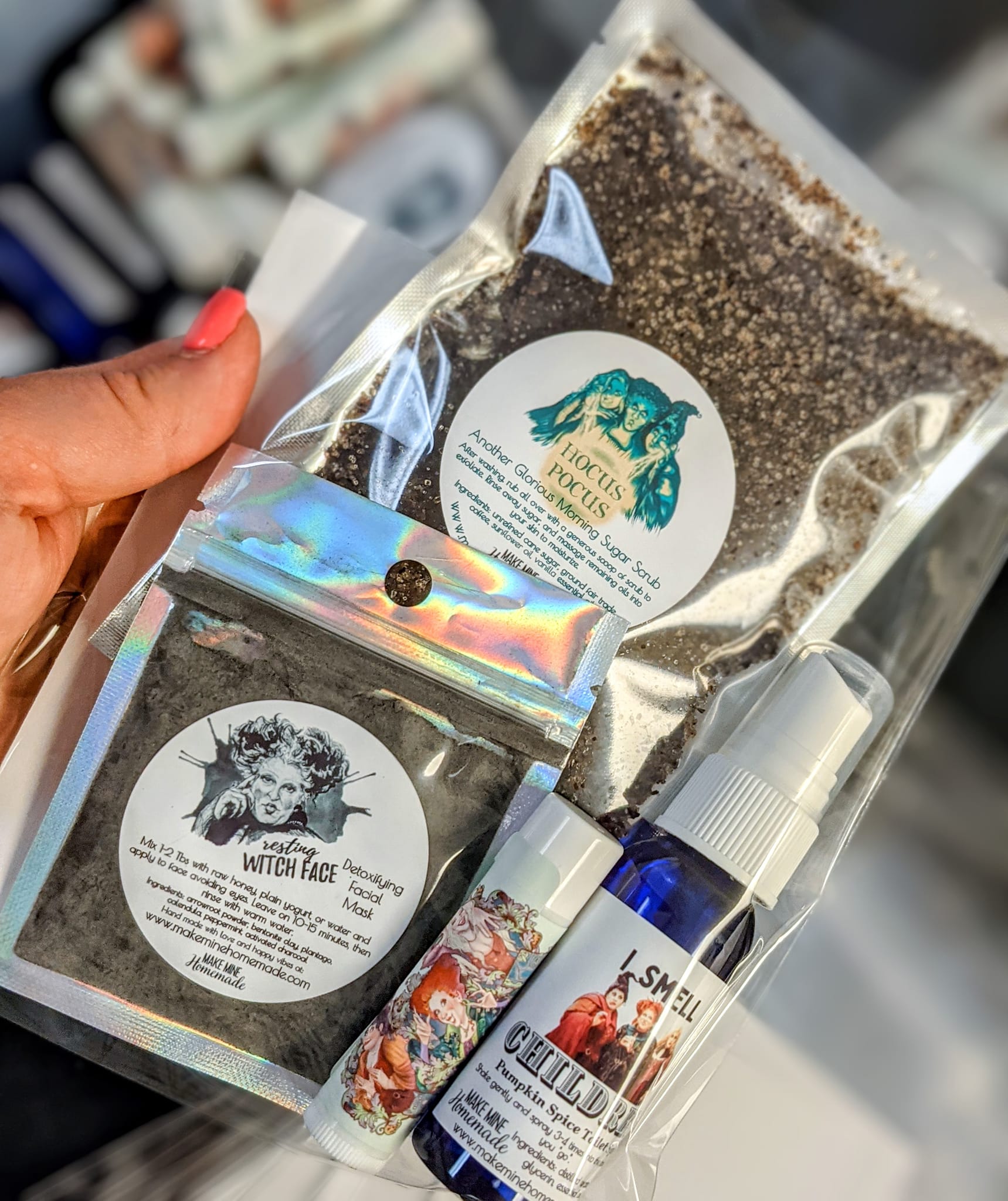 Party pack: Sample scrub, sample face mask, 1oz spray, and a lip balm!